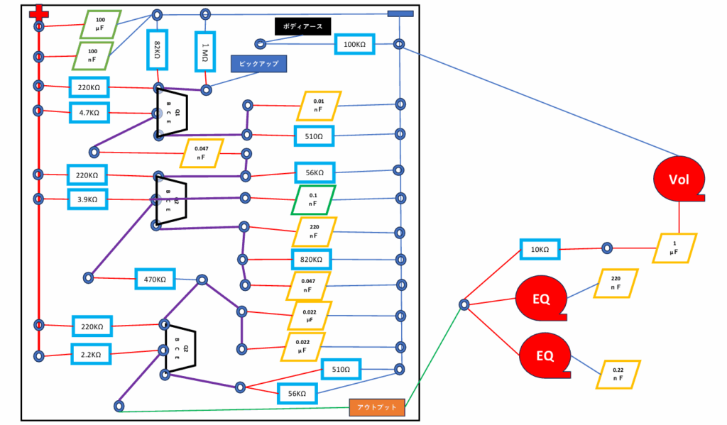 前回の記事であったように大きな変化はありませんが5.6弦の太さとコンデンサーのフィルタリングで整った音ではありますが倍音を感じるようなニュアンスになりました。