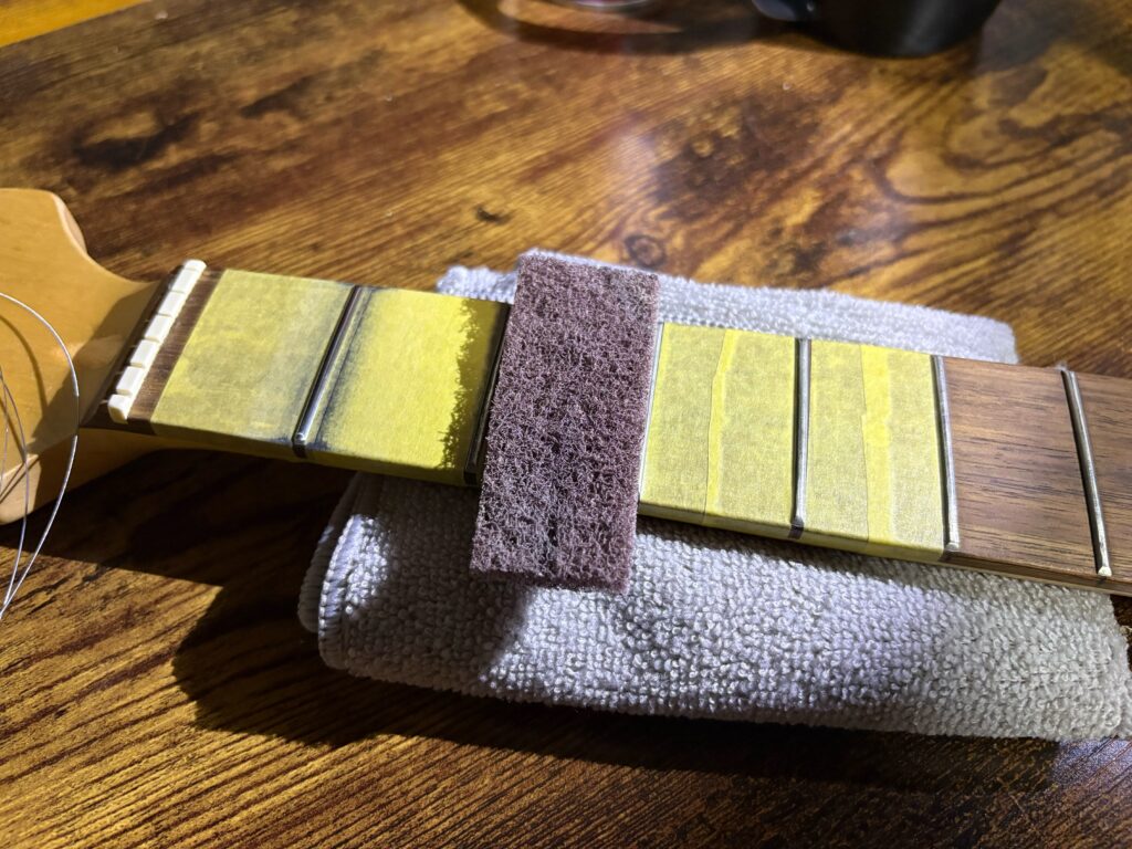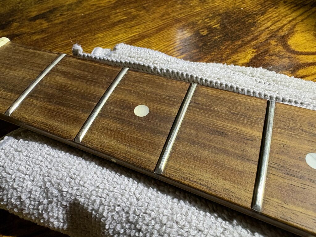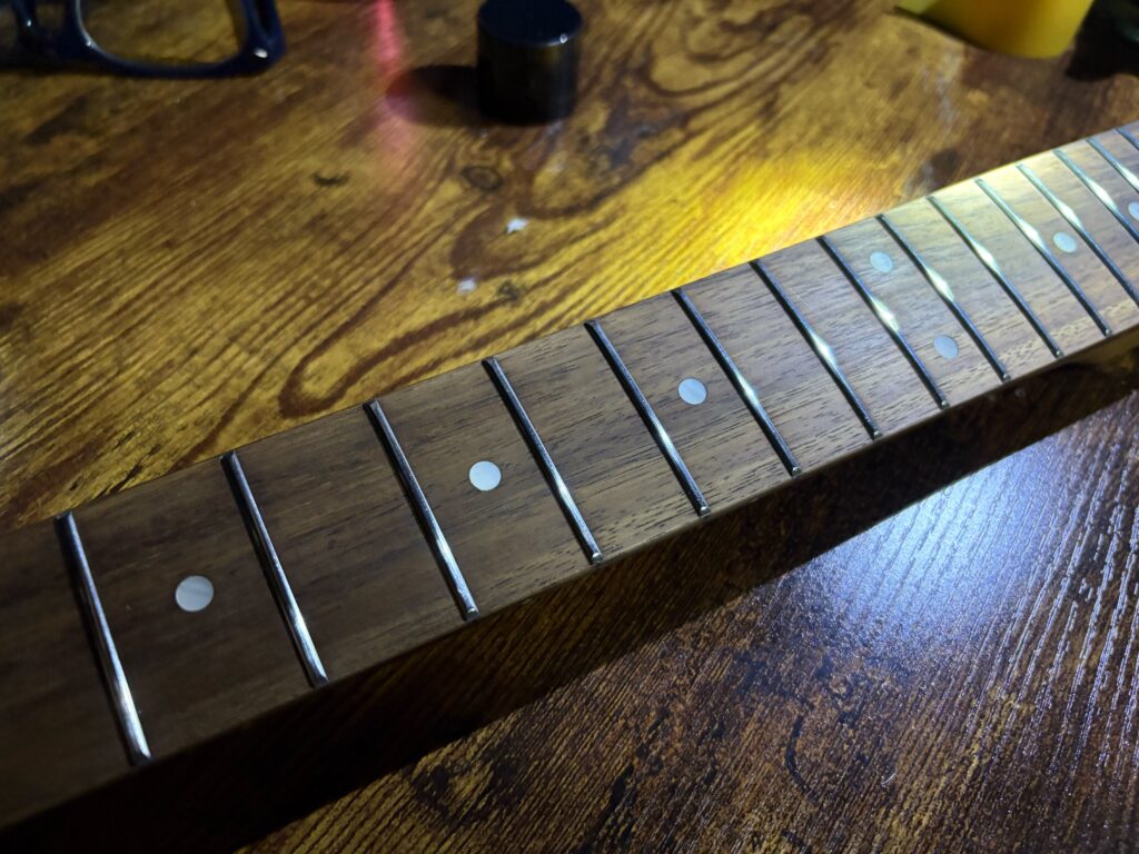 仕上げはフレット磨き。安価なギターは大量生産の影響で端部にバリがあったり、表面に酸化で白く濁りが…。