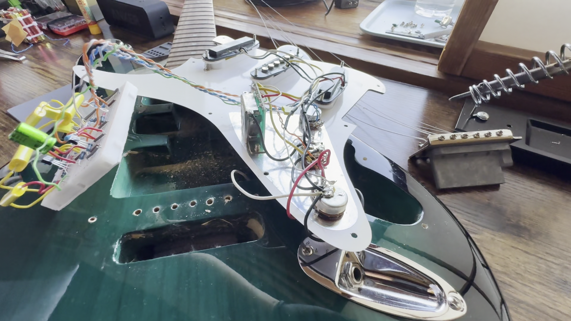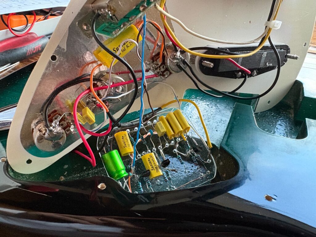 大きめのコンデンサーもピックガードに固定すればスペース配分もGOOD👍